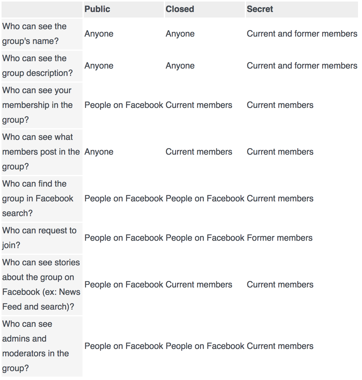 เพจสำหรับกลุ่มจะไม่สามารถดูได้โดยผู้ใช้งาน Facebook ทุกคนเสมอไป ซึ่งไม่เหมือนกับ เพจของ Facebook ที่ใช้สำหรับนำเสนอแบรนด์ ธุรกิจ องค์กร หรือบุคคลที่มีชื่อเสียงที่ให้บุคคลทั่วไปเข้าไปดูเพจได้ เมื่อสร้างกลุ่ม คุณสามารถเลือกหนึ่งในสามรูปแบบของการตั้งค่าความเป็นส่วนตัว ได้แก่ แบบเปิดให้บุคคลทั่วไปเข้าดู แบบปิด หรือแบบเป็นความลับ ในตารางนี้ Facebook แสดงข้อมูลของบุคคลที่สามารถเข้าร่วมกลุ่มเหล่านี้ได้และข้อมูลเกี่ยวกับกลุ่มที่บุคคลดังหล่าวสามารถดูได้ ตามการตั้งค่าความเป็นส่วนตัวที่ได้เลือกไว้